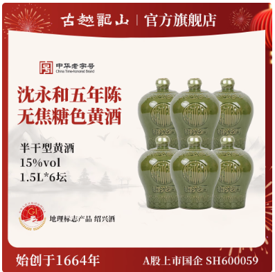 古越龙山绍兴黄酒官方旗舰店五年陈1.5L无焦糖色正宗沈永和花雕酒