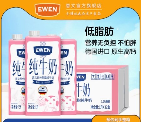 意文部分脱脂低脂纯牛奶1L*12盒德国进口高钙成人学生营养早餐奶